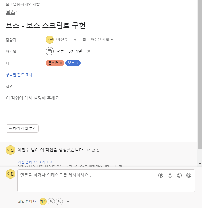 개발 일정 Asana 프로젝트 매니저로 업데이트